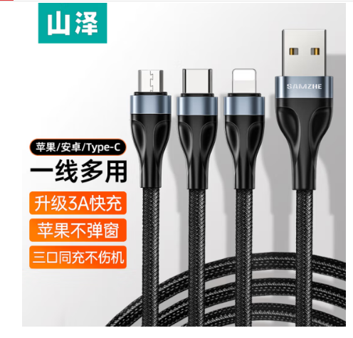 山泽 三合一快充数据线一拖三充电线支持苹果iphone华为oppo/vivo充电 安全快充1.2米 AS12A SKU:yzwhyp973036