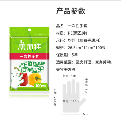 美丽雅 一次性手套100只入 PE材质加厚防漏卫生手套食品用 塑料手套厨房餐桌餐厅野餐适用 SKU:yzwhyp976336