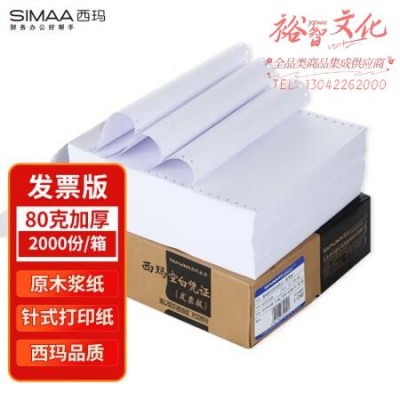 首页 > 办公用品 > 文具 > 西玛(SIMAA)80g针式发票版空白凭证打印纸 240*140mm 2000份/箱 带孔空白单据记账凭证财务办公用品12310 SKU:SKU:yzwhyp981753