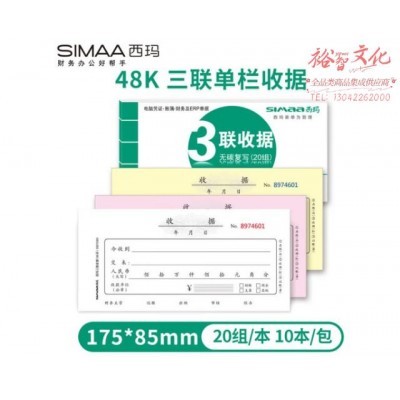 西玛(SIMAA)三联单栏收据 财务手写收据单 48开 175*85mm 无碳复写 20组/本 10本装 SKU:SKU:yzwhyp982012