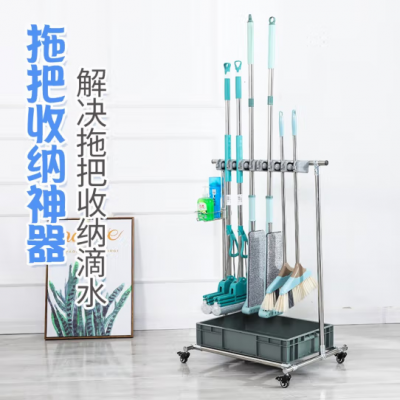 首页 > 用具 > 其他厨房用具 > 落地式可移动拖把架不锈钢置物架放扫把固定挂架清洁工具收纳架子 【10挂12钩】【灰盘】【移动款