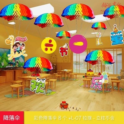 墨申六一儿童节教室气氛装饰创意降落伞挂件61幼儿园舞台吊顶场景布置 彩色降落伞8个 拉旗HY-07 挂钩8 装扮用品SKU:yzwhyp993239