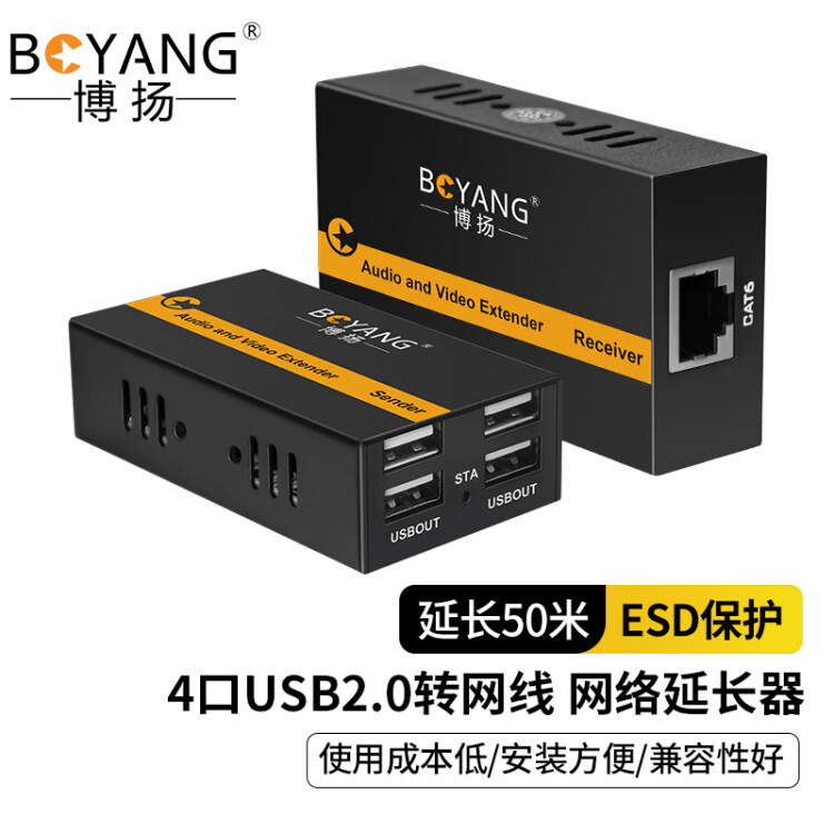 博扬 USB网络延长器 网线延长器 4口USB2.0转网线传输器信号放大器50米 BY-EX-U50SKU:yzwhyp1003469