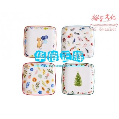 网易严选 田园手绘系列 碟子烤盘 耐摔加厚骨头碟 可进微波炉小方盘碟 方碟 4只装HXZH06181606307839SKU:yzwhyp1006369