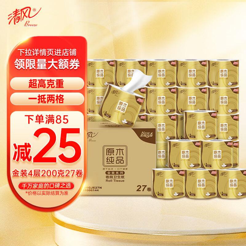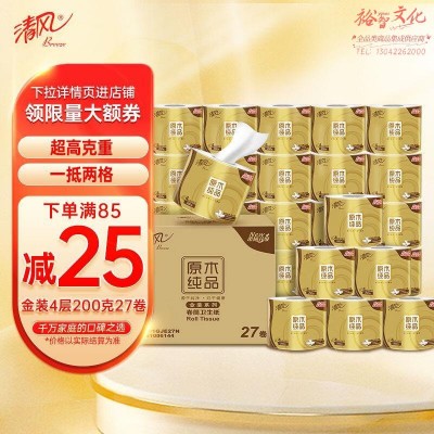 清风有芯卷纸 原木金装4层加厚200克*27卷 卫生纸卷筒纸纸巾卷纸整箱SKU:yzwhyp1006817