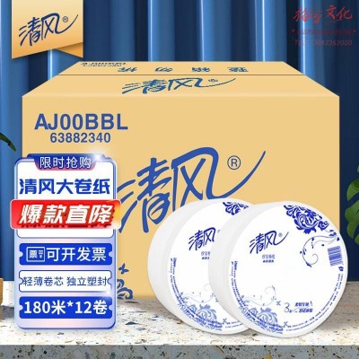 清风有芯大卷纸3层180米*12卷商用大盘纸厕所卷筒卫生纸公用装AJ00BBLSKU:yzwhyp1006818