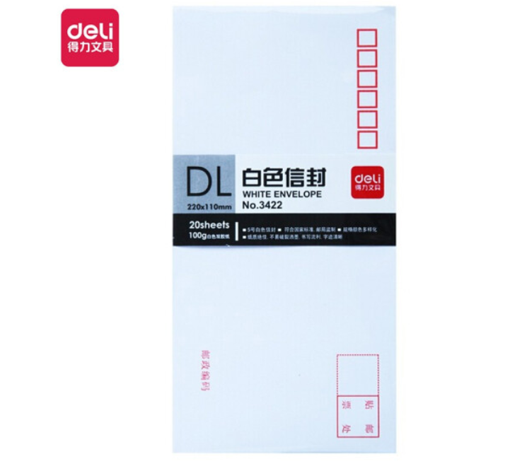 得力3422白色信封(白)-5号(20个/包)GDSMSKU:yzwhyp1015736