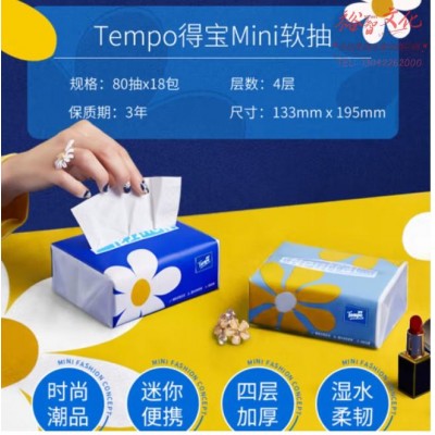 首页 > 办公用品 > 卫生用纸制品 > 得宝(TEMPO)一博同款 抽纸 Mini系列4层80抽*4包 湿水不易破 餐巾纸 卫生纸SKU:yzwhyp1031317