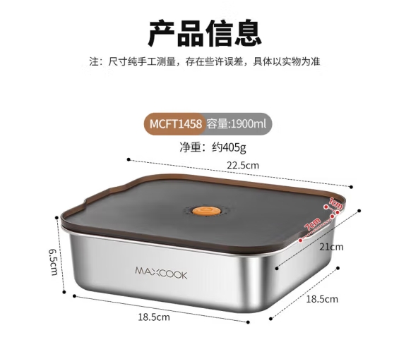 美厨(maxcook)304不锈钢保鲜盒 带盖饭盒便当盒冰箱密封储物盒1.9L提手MCFT1458SKU:yzwhyp1032745