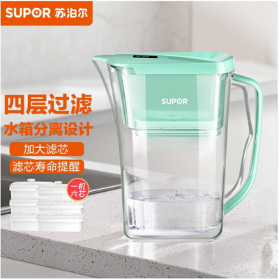 苏泊尔(SUPOR)J-UF01 过滤净水器 家用滤水壶 自来水过滤器净水壶 (绿色)一壶六芯