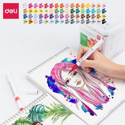 得力70809-64色细三角杆水性软头马克笔(混)(64色/桶)