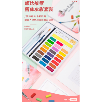 得力(deli)24色固体水彩颜料 8件套(自来水笔画笔铅笔调色盘水彩纸橡皮)美术专用手绘水彩画专业级艺考73876