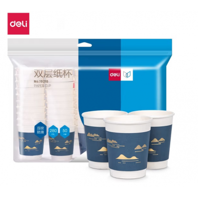 得力(deli)双层一次性纸杯 烫金压纹咖啡杯 商务招待厚纸杯 19215 双层纸杯蓝色50只/袋280ml