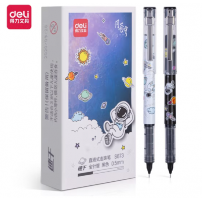 得力(deli)×航天少年直液笔签字笔 0.5mm全针管办公商务中性笔走珠笔 黑色 12支/盒 S873