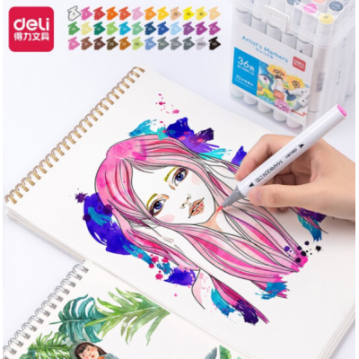 得力(deli)36色水性软头双头马克笔 学生儿童无气味水彩笔彩绘画画卡通美术专业画具画材 手提桶70809