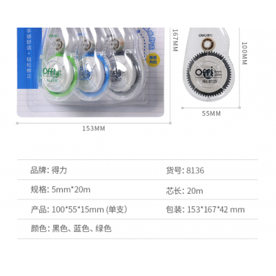 首页 > 办公用品 > 文具 > 得力/deli 8136修正带套装(混)20m*3