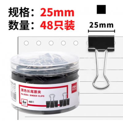 得力(deli)长尾夹8564黑色25mm票夹金属燕尾夹票据夹子办公用品中号48只/桶
