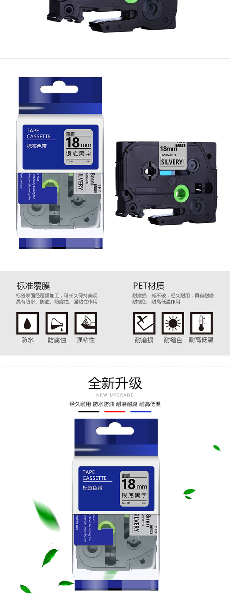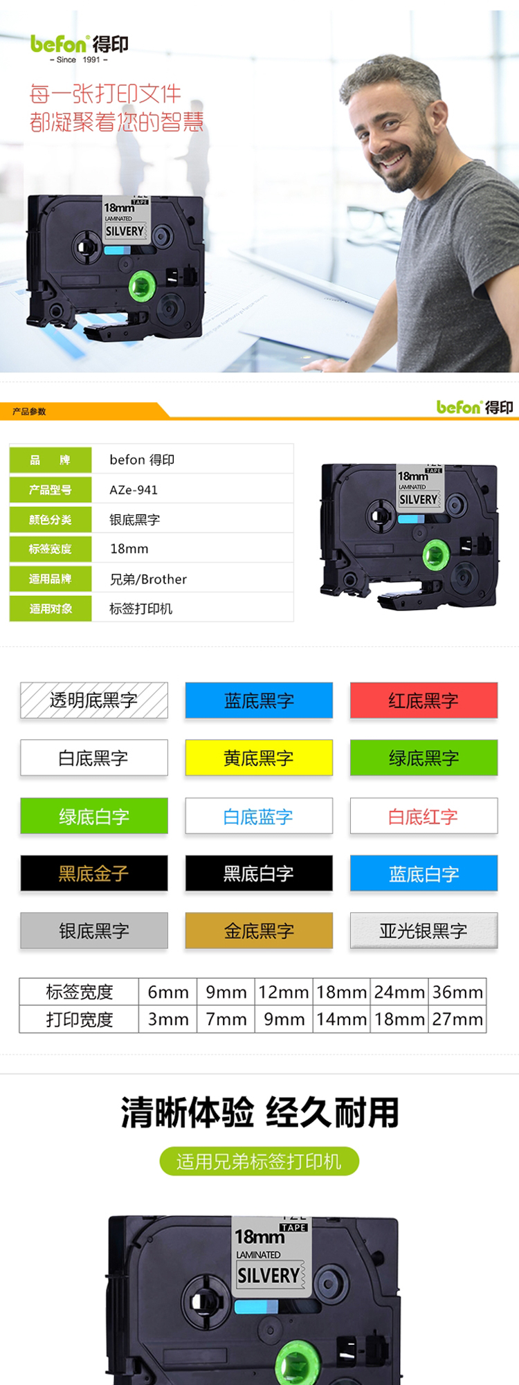 得印(befon) 18mmAZe-941 标签机色带不干胶兄弟标签纸色带 银底黑字 适用兄弟brother PT-D200 PT-D210 PT-2030
