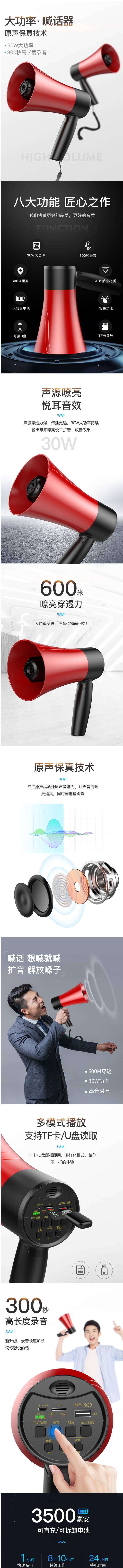 雅兰仕 903录音大叭扬声器手持充电喊话器扩音器高音喇叭扬声器 黑红色