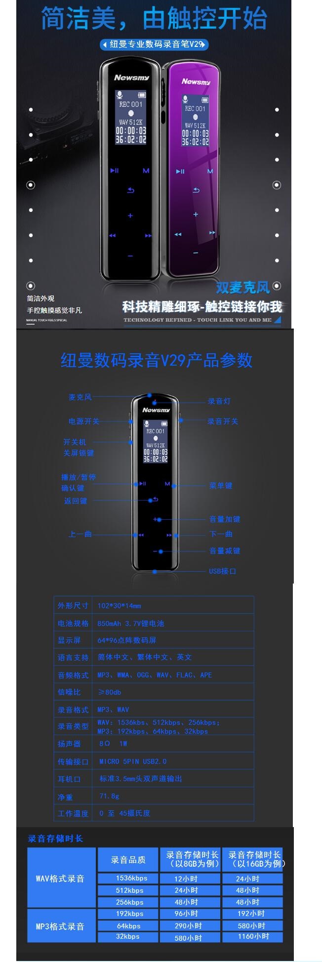 纽曼(Newsmy)录音笔 V29 16G 大电量长待机 触控键专业高清远距降噪声控FM收音机 学习培训会议留证 渐变紫
