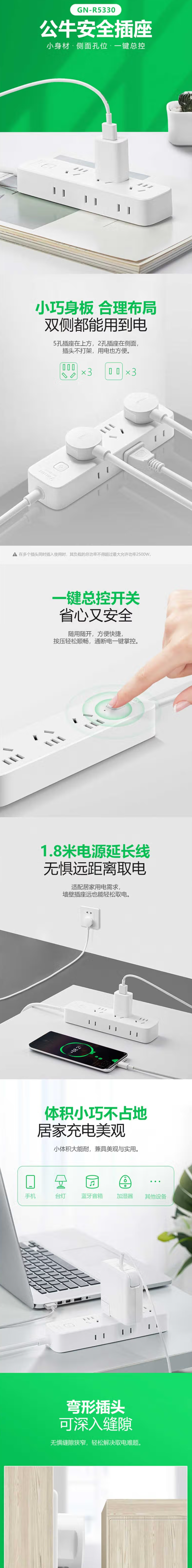 公牛 1.8米 GN-R5330 插排新国标插座插线板拖线板 6位总控