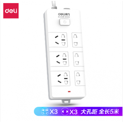 得力18257插座_3+3_5米_PVC袋装(白)(只)