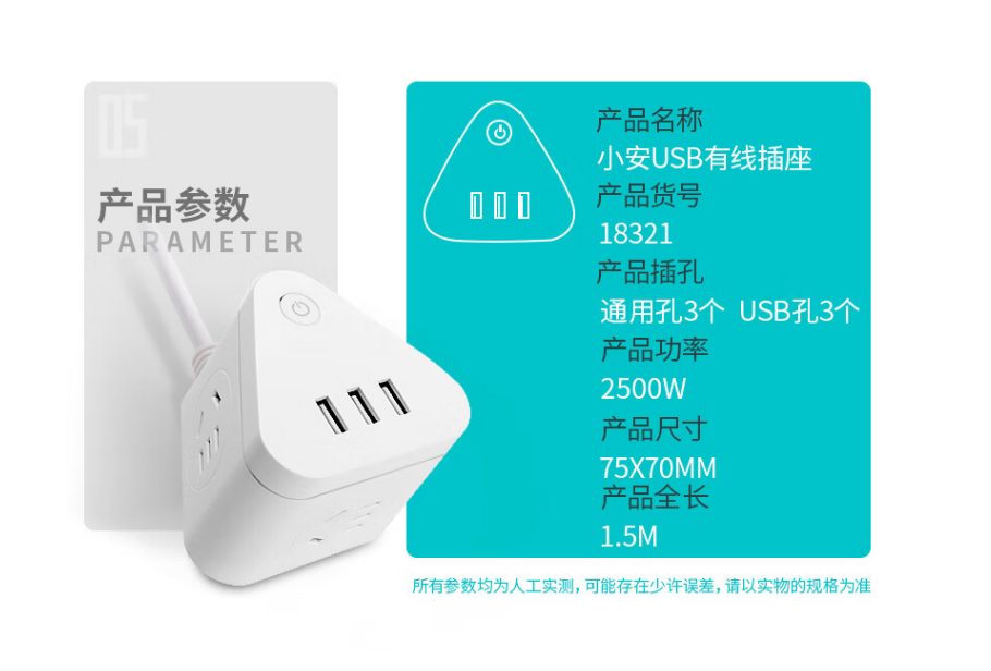 得力18321插座_3组+3U_1.5米_彩盒装(白)(只)