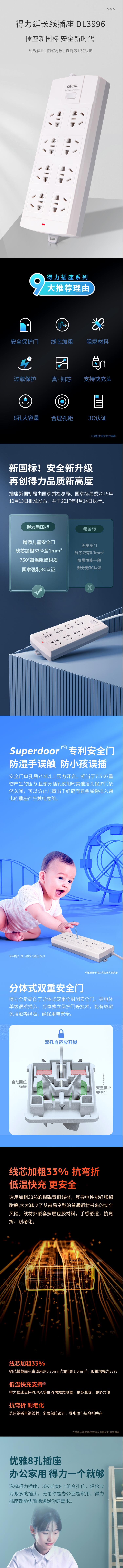 首页 > 建筑建材 > 开关插座 > 得力(deli)3996 总控开关 8位3米 过载保护 插线板/接线板/拖线板 新国标 大孔距