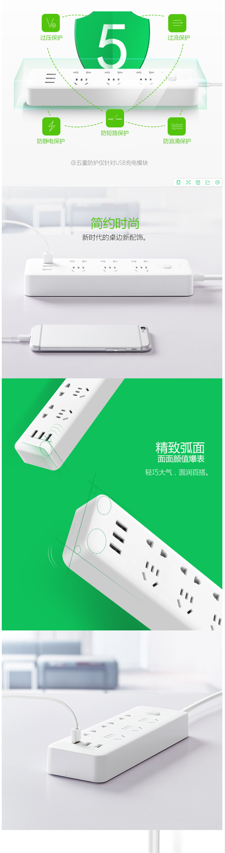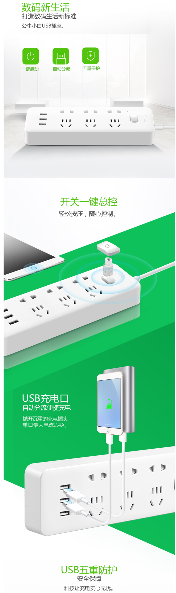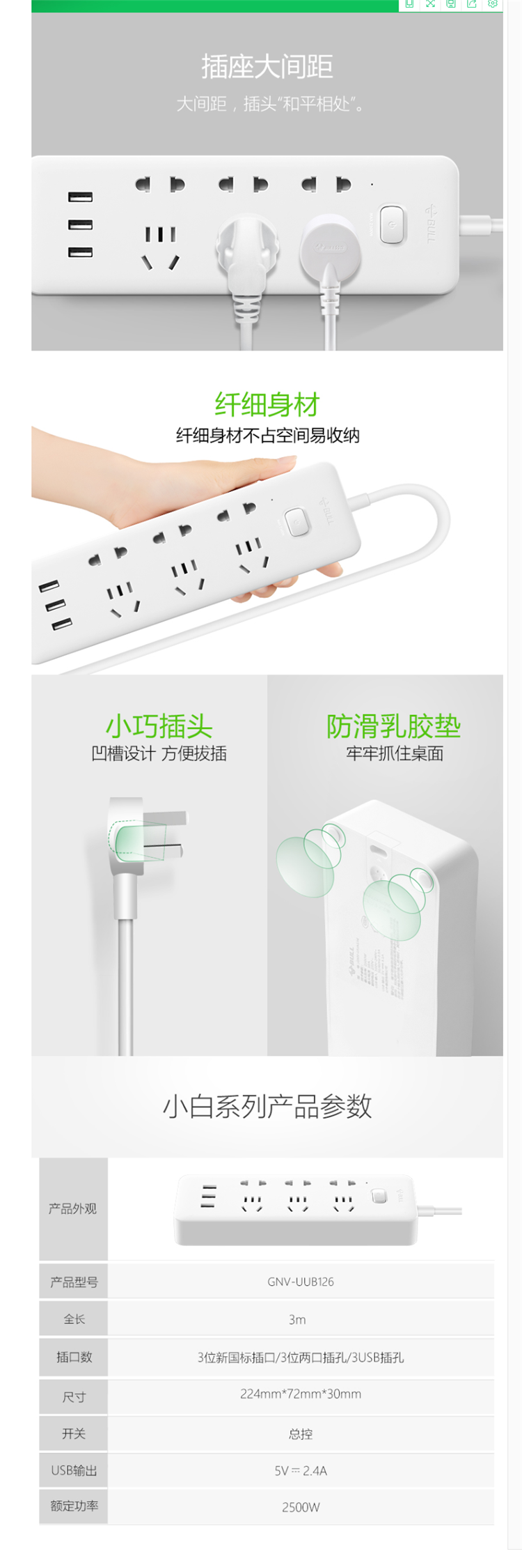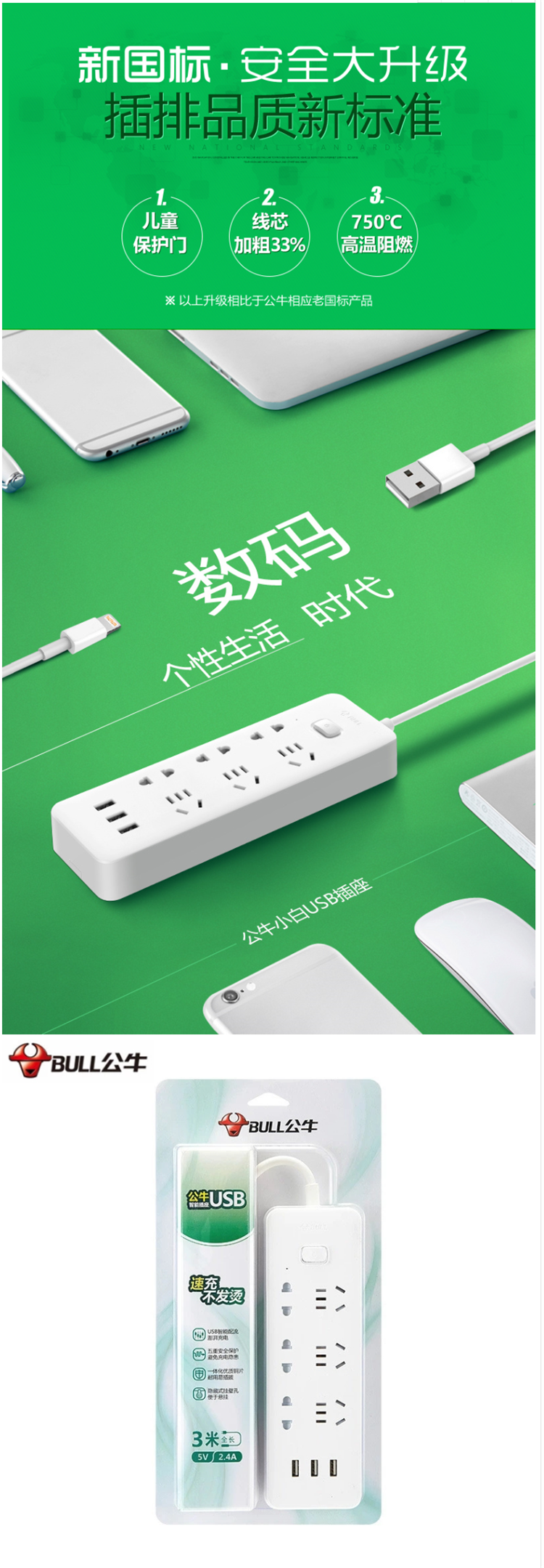 公牛(BULL)小白USB插座拖线板2USB排插3USB插座UUD122/UUB126 GN-UUB126 3米