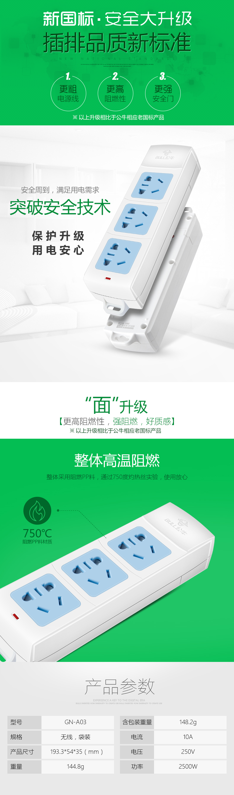 首页 > 建筑建材 > 开关插座 > 公牛(BULL) GN-A03 不带电源线 无线 多位插座 10A250V