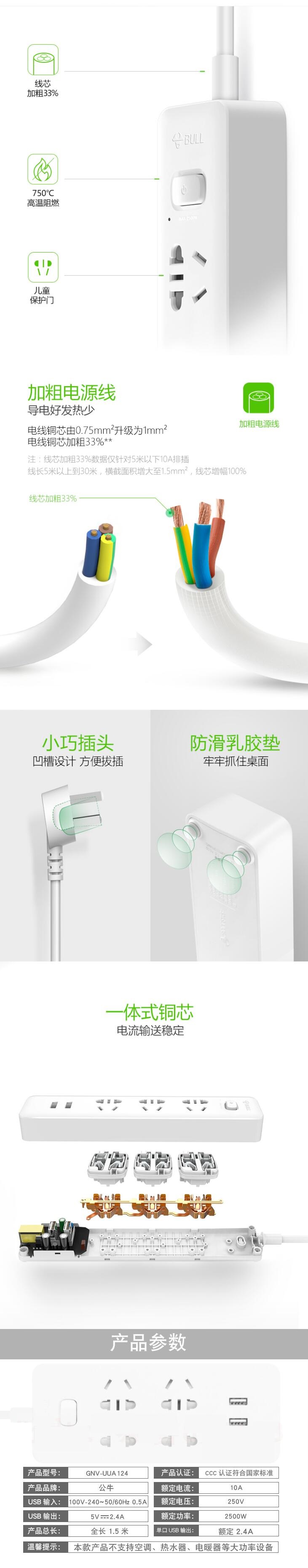 公牛(BULL) GNV-UUA124 USB插座智能插座充电插排拖接线板 GN-B422U升级版 1.5米 10A
