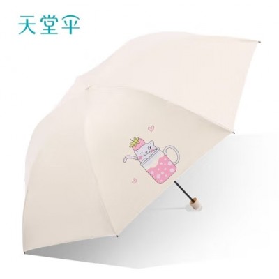 天堂雨伞33796E夏日喵饮三折超轻便铅笔伞晴雨两用卡通雨伞防晒女-奶酪色雨伞