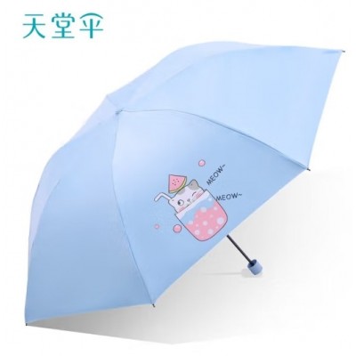 天堂雨伞33796E夏日喵饮三折超轻便铅笔伞晴雨两用卡通雨伞防晒女-粉蓝色雨伞