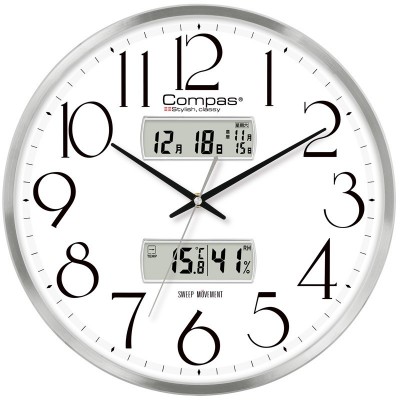 首页 > 仪器仪表 > > 康巴丝(COMPAS)挂钟 创意万年历石英钟表挂墙客厅卧室时钟日历温湿度挂表 C3240-2 银色