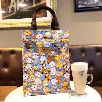 卡通印花A4手提袋防水网红补课包妈咪学生拉链手提袋大容量饭盒手拎包-蓝底喵星人(中号铝膜款)