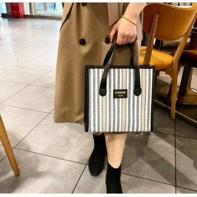 经典手提袋彩色条纹织布手提袋妈咪包便携时尚日式四方外出通勤手拎袋-双色可选包包