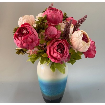 规格:整体高度约50CM , 6朵牡丹花头,直径约8-9CM ,2朵小花包,2朵绣球,2花穗1绿植叶