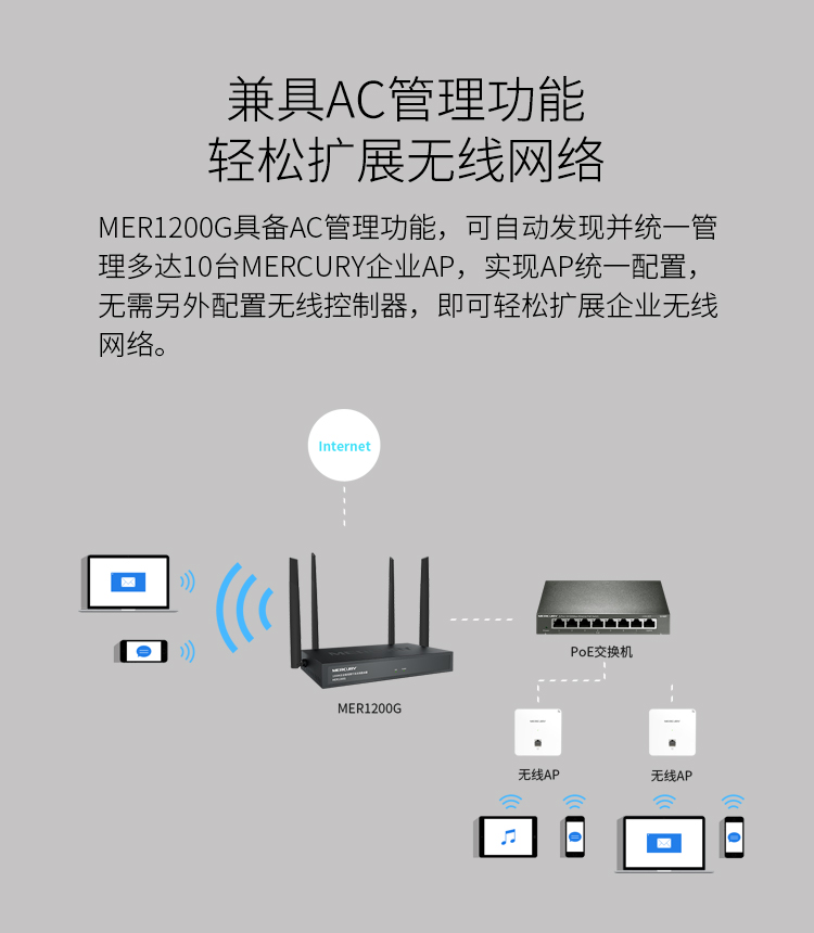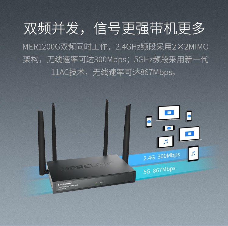 水星(Mercury)1200M 5G双频无线企业级路由器 wifi穿墙/VPN/千兆端口/AC管理 MER1200G