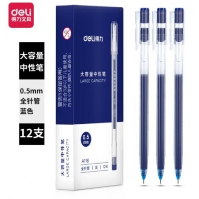 得力(deli)大容量全针管中性笔签字笔 笔芯笔身一体化0.5mm蓝色12支/盒DL-A116