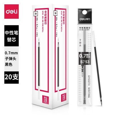 得力S753子弹头中性笔芯0.7mm子弹头 中性笔水笔签字笔替芯 办公用品 (黑)20支