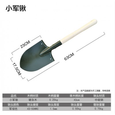 小军锹:全长63CM     铲头宽17CM  铲头长22CM  厚度1.5MM