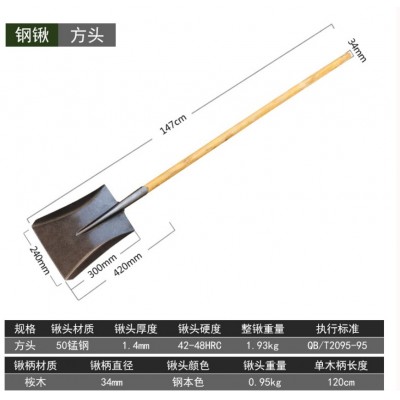 铁锨农用挖土种花钢锹户外铲子 加厚大铁锹(带柄钢色方型锹)