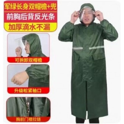 首页 > 建筑建材 > 其他防护用品 > 工厂男士连体雨衣 户外成人雨衣反光条加厚长款雨衣 长款雨衣加兜双帽檐款军绿尺码可选