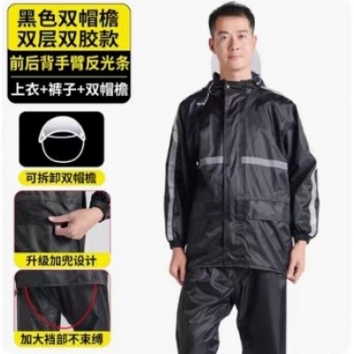 首页 > 建筑建材 > 其他防护用品 > 双层双胶男女雨衣套装牛津布分体雨衣大帽檐摩托车雨衣双层双胶(加口袋+双帽檐+档)颜色随机尺码可选