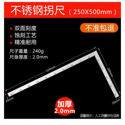 首页 > 建筑建材 > 五金附件 > 不锈钢拐尺/L尺(250x500mm双面都有刻度)木工直角尺拐角尺L型尺