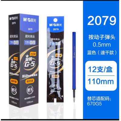 晨光(M&G)文具0.5mm蓝色中性笔笔芯替芯 秒干替芯笔芯 子弹头按动款签字笔替芯笔芯 优品系列金装笔芯替芯 水笔芯替芯 单支装2079 0.5mm(蓝)