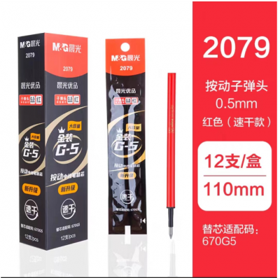 晨光(M&G)文具0.5mm红色中性笔笔芯替芯 秒干替芯笔芯 子弹头按动款签字笔替芯笔芯 优品系列金装笔芯替芯 水笔芯替芯 单支装2079 0.5mm(红)