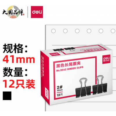 得力(deli)41mm大号金属黑色长尾夹/票据夹/燕尾夹/票据文件夹子 2# 12只/盒 9542