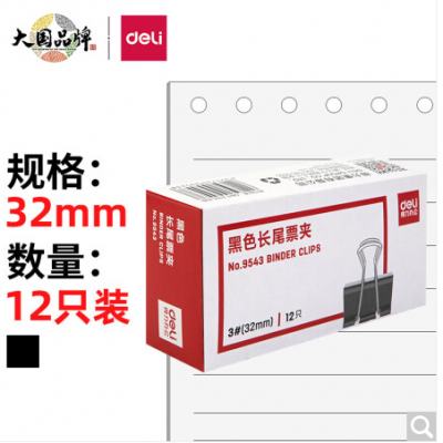 得力(deli) 黑色长尾夹/长尾票夹大中小号票夹金属夹子鱼尾夹燕尾夹文件夹子 9543【3#32mm】12只/盒