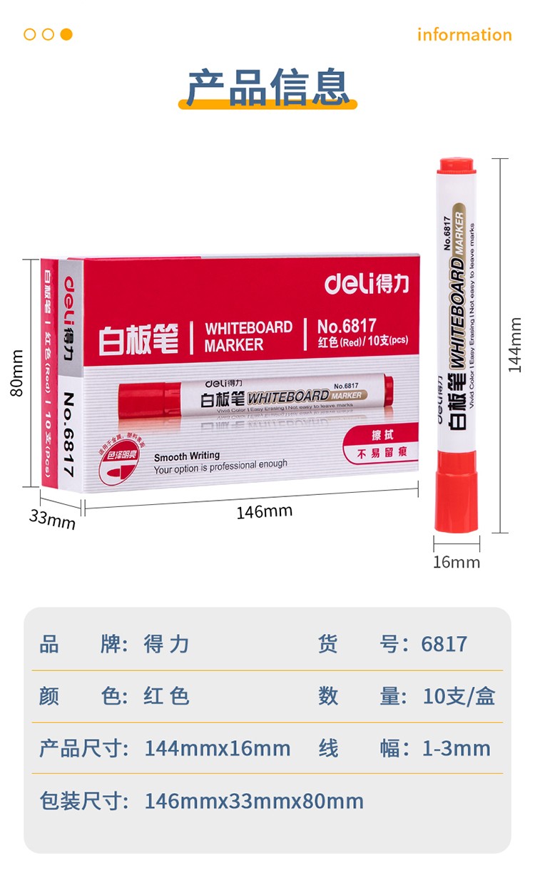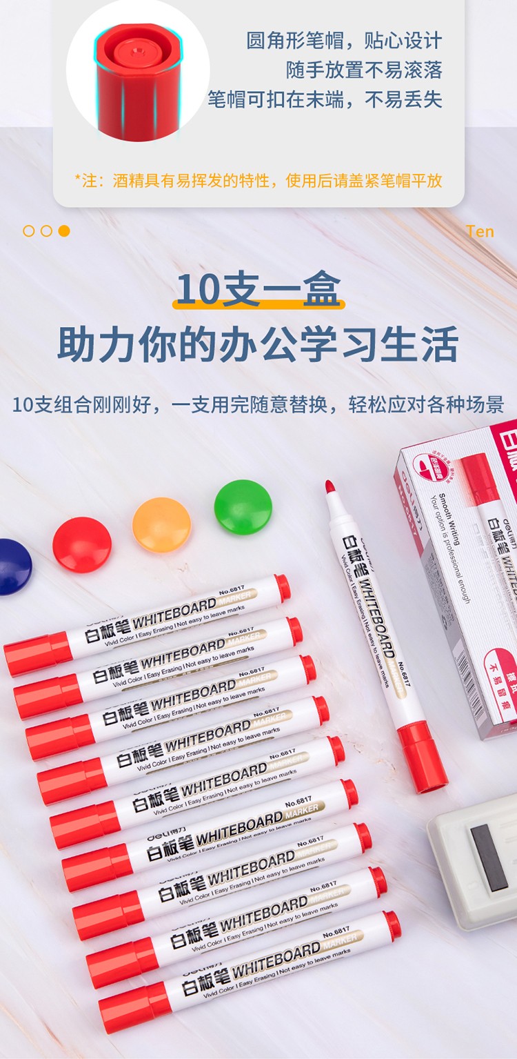 得力(deli)白板笔 色泽明亮白板笔 可擦易擦白板笔 红色10支/盒6817 办公用品
